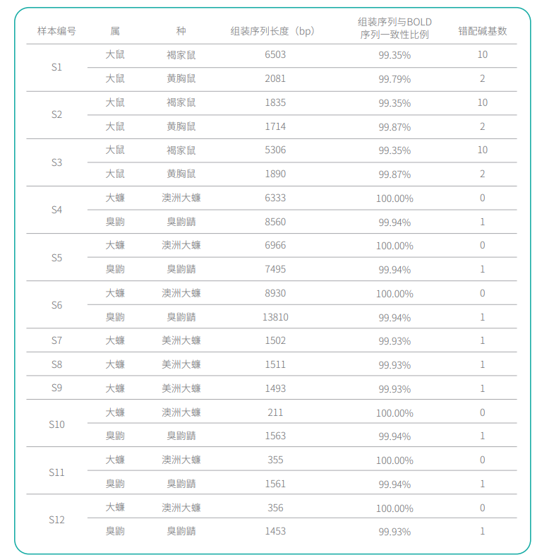 對12例樣本進行檢測,系統自動輸出物種識別結果及線粒體的組裝序列,混合樣本輸出2條結果,所有樣本的病媒物種識別結果完全符合預期。