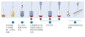進(jìn)而在漂洗液中將與磁珠非特異結(jié)合的各種雜質(zhì)去除,最后使核酸分子溶解于洗脫液中。
