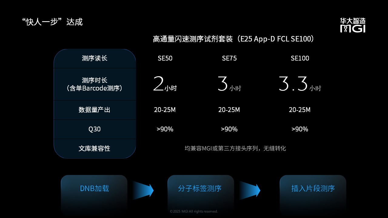 2025年2月20日,在IND2025第五屆感染疾病診斷技術及檢測自動化建設論壇上,華大智造正式發布全新的自發光半導體測序儀——DNBSEQ-E25 Flash(以下簡稱“ E25 Flash”)閃速基因測序儀,E25 Flash在原有E系列測序儀機型基礎上,融合一系列 AI 工具,在生化原材料和堿基算法上實現雙重提升。華大智造也同時推出了DNBSEQ-E25 Flash閃速測序方案,最快可在2小時內完成SE50測序。